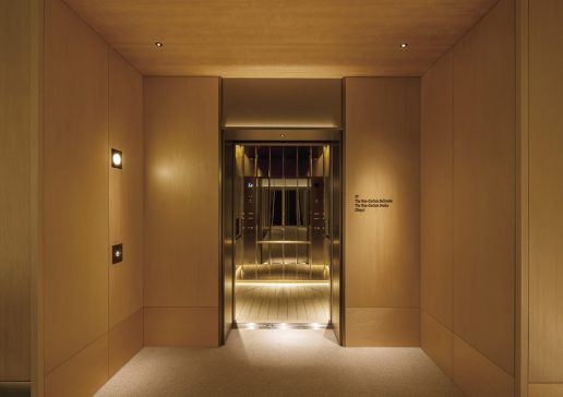 The elevators with the interior space created by the combination of the soft illumination of down-lights and the flagstone-like floor provide a very comfortable movement to the guests and visitors.