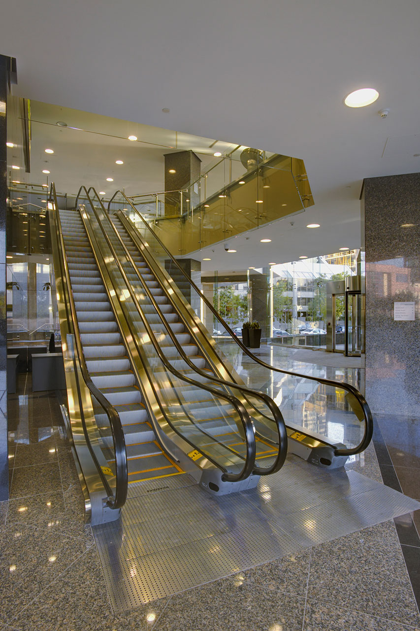 Livingston Place Twin Towers are first-class office buildings located in downtown Calgary, the largest city in the Province of Alberta. The two 22-story buildings are served by 24 Fujitec elevators and four escalators. Polished natural stone panels and tiles and stainless steel are extensively used for the exterior finish of the elevator landings and cab fixtures, creating an elegant atmosphere. Gracefully-designed escalators in the atrium create a sophisticated image, which is helpful to accentuate the high-class image of the office buildings.