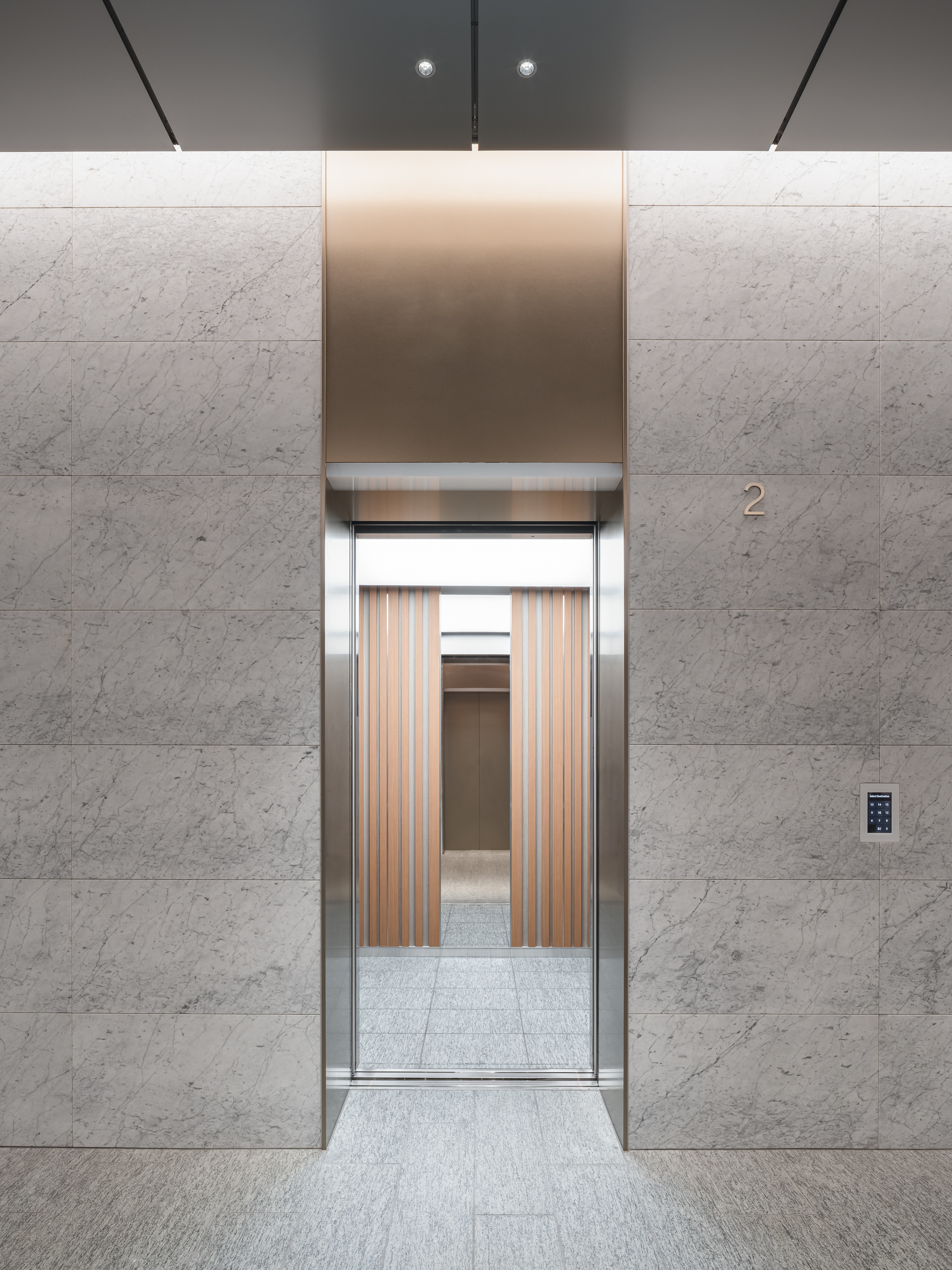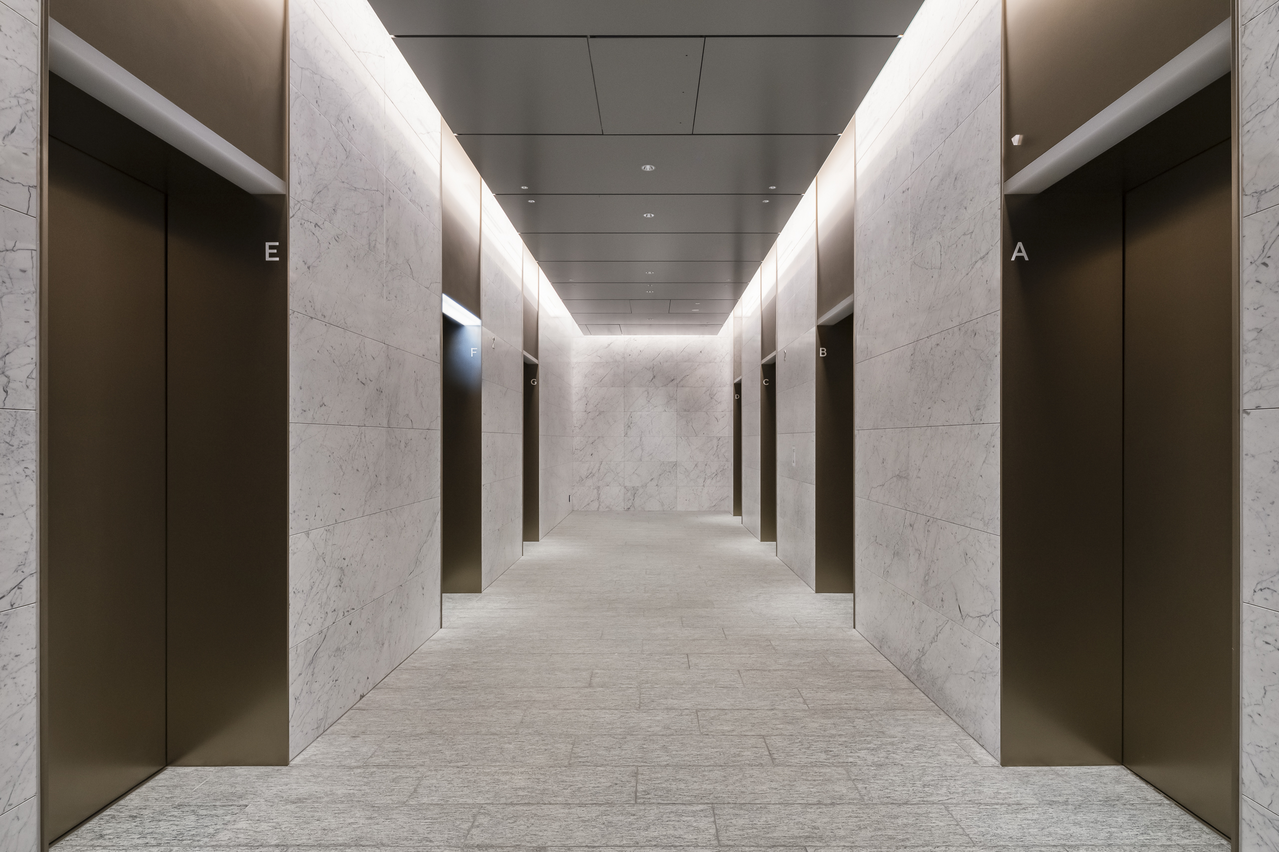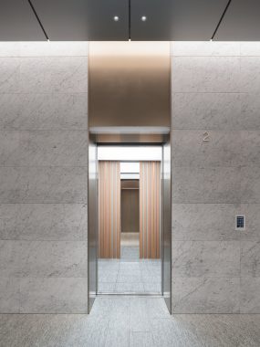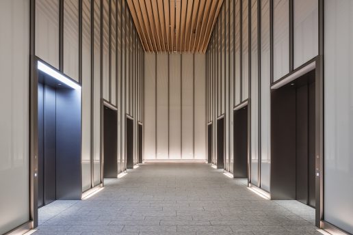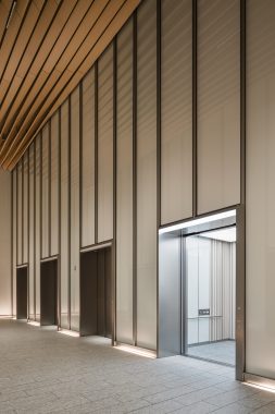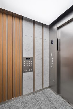 For design, wood rib panels and marble-like finishes are adopted, harmonizing with the high-quality, tranquil space design of the landing areas.