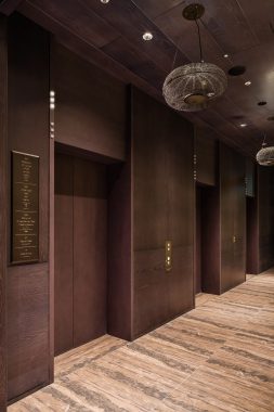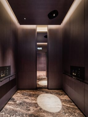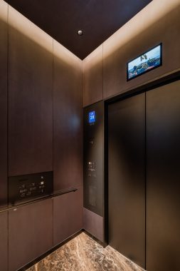 The elevators pursue a premium ride quality and design befitting a luxury hotel. The floor design features a motif of the moon over Gotenyama (historically famous for the Shogun villa and Japanese garden), reflecting Takanawa's long-cherished reputation since the Edo period as a famous spot for cherry blossom viewing and moon appreciation. The position of the escalators allows natural light to enter, while skirt-guard LED lighting softly illuminates the foot area, enhancing the elegant space.
