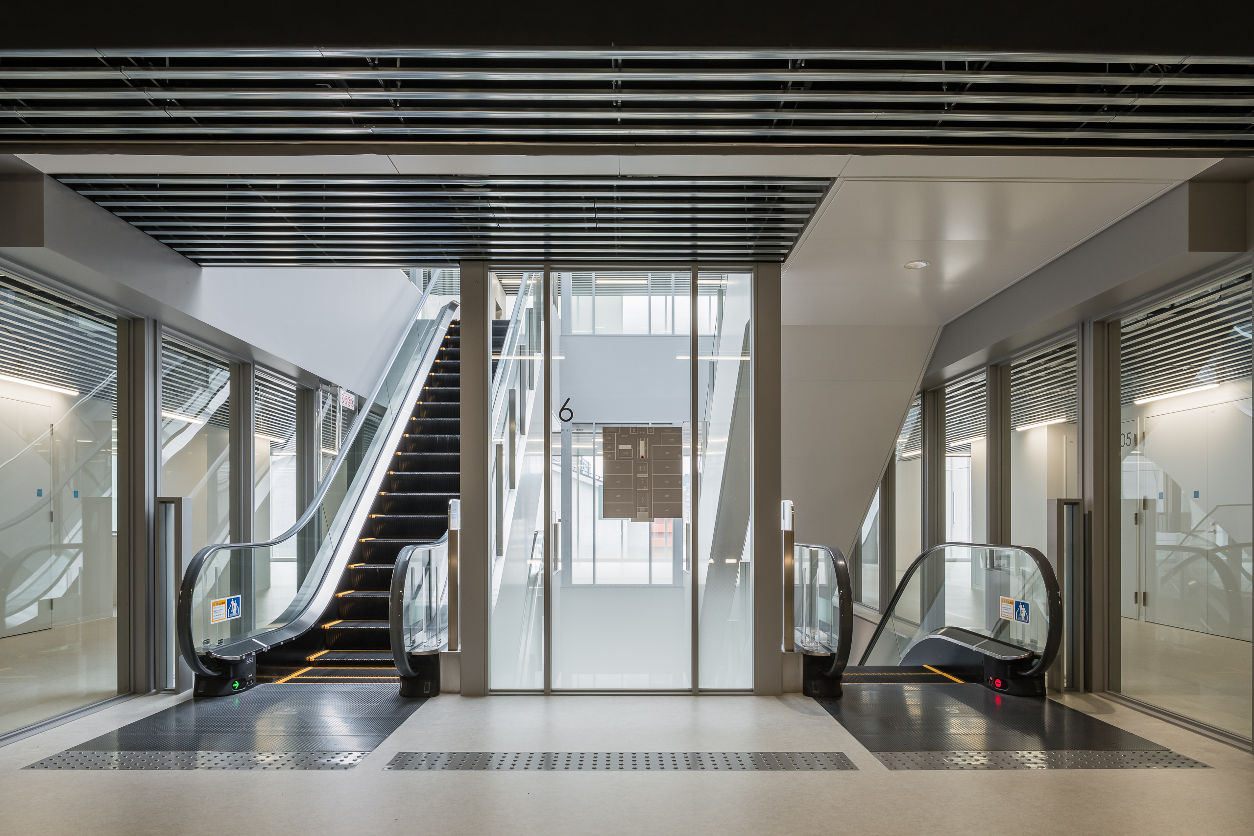 Part of the building features a double-height atrium. The design, where escalators visually cross between floors, adds accents and a sense of spaciousness to the entire area. It supports the smooth and comfortable movement of students and faculty between floors every day.