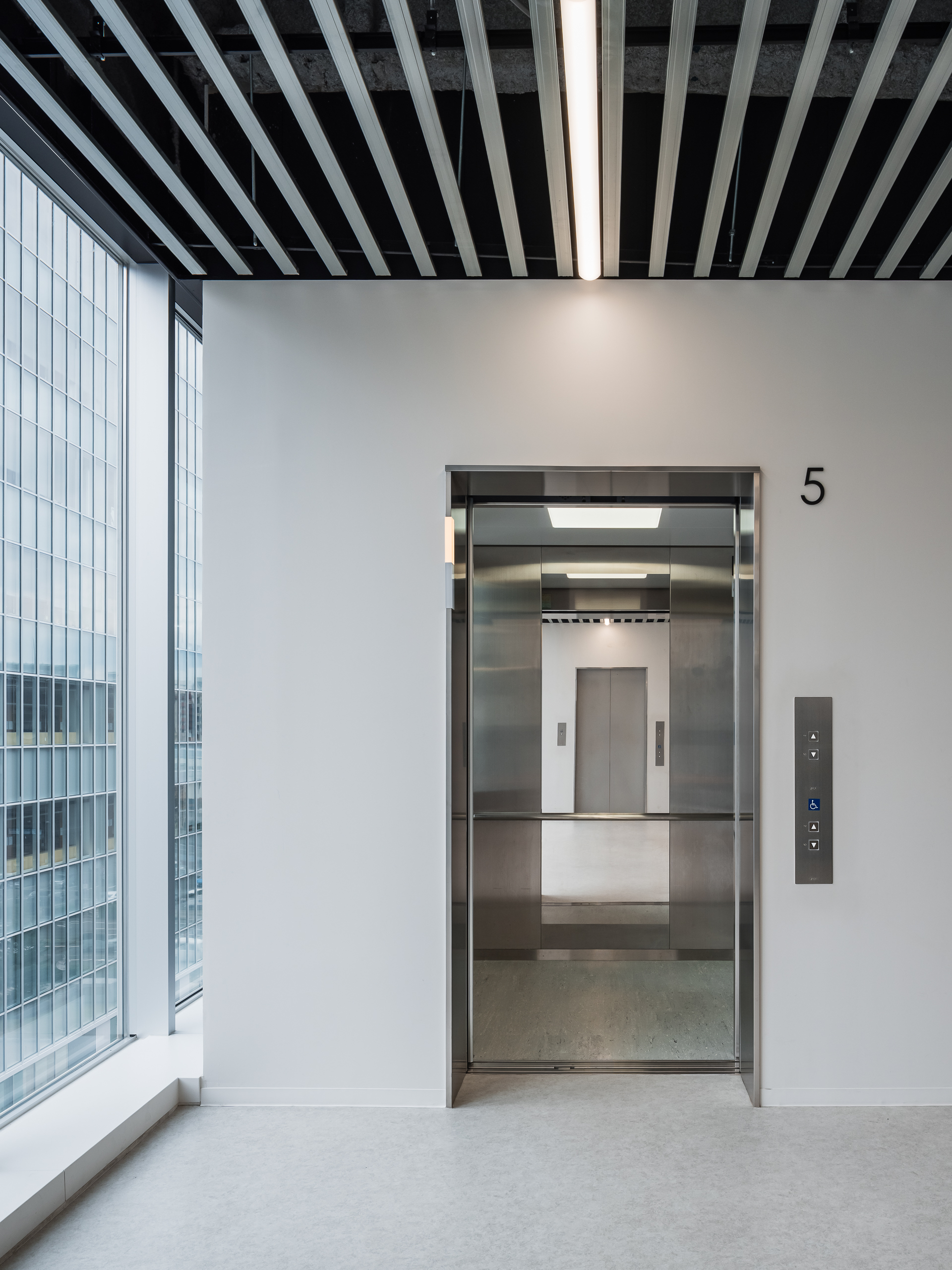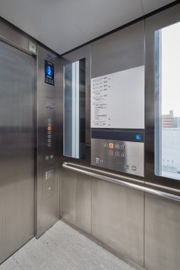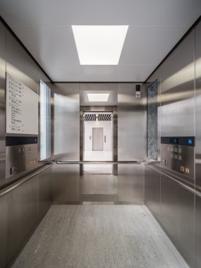 The elevators feature stainless steel interiors throughout, creating a refined impression.