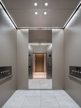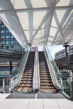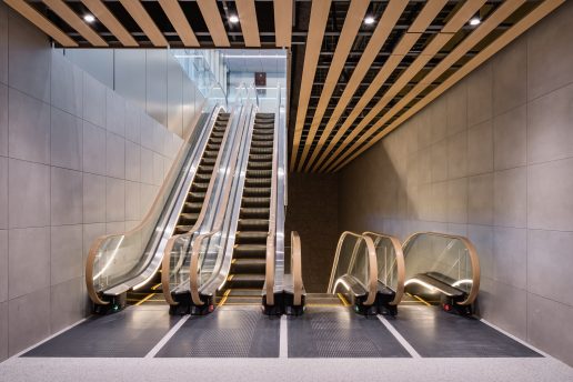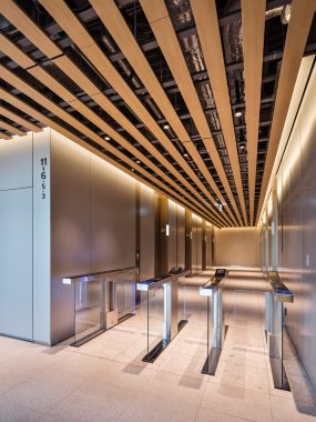 Fujitec supplied a total of seventy-six (76) units here: forty-six (46) elevators and thirty-two (32) escalators. The office tower elevators are equipped with the “EZSHUTTLE” destination registration system, which reduces congestion and enables efficient operation, supporting smooth vertical movement.