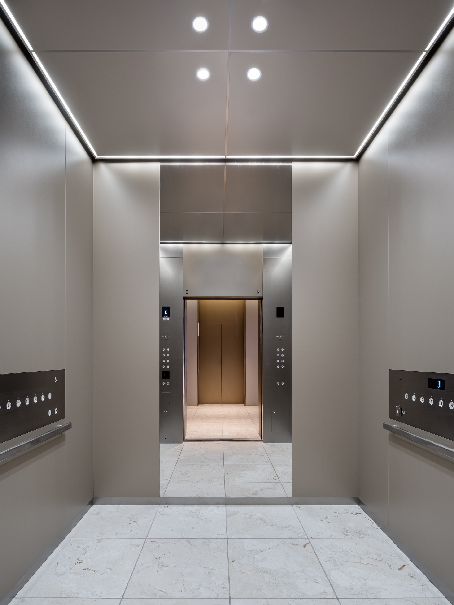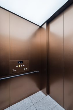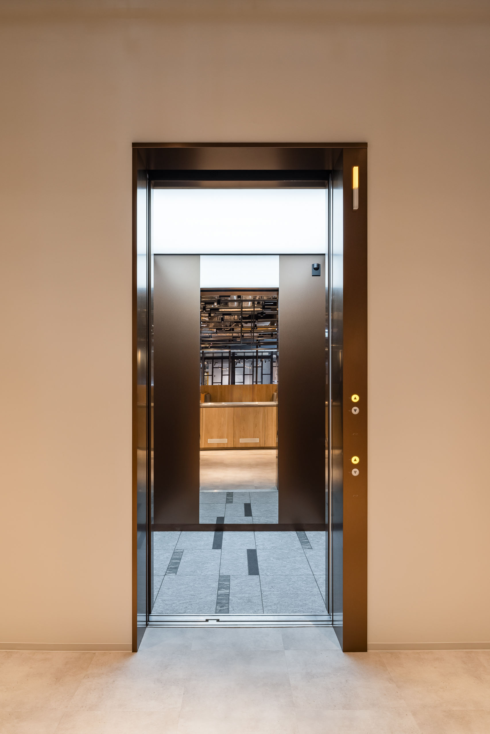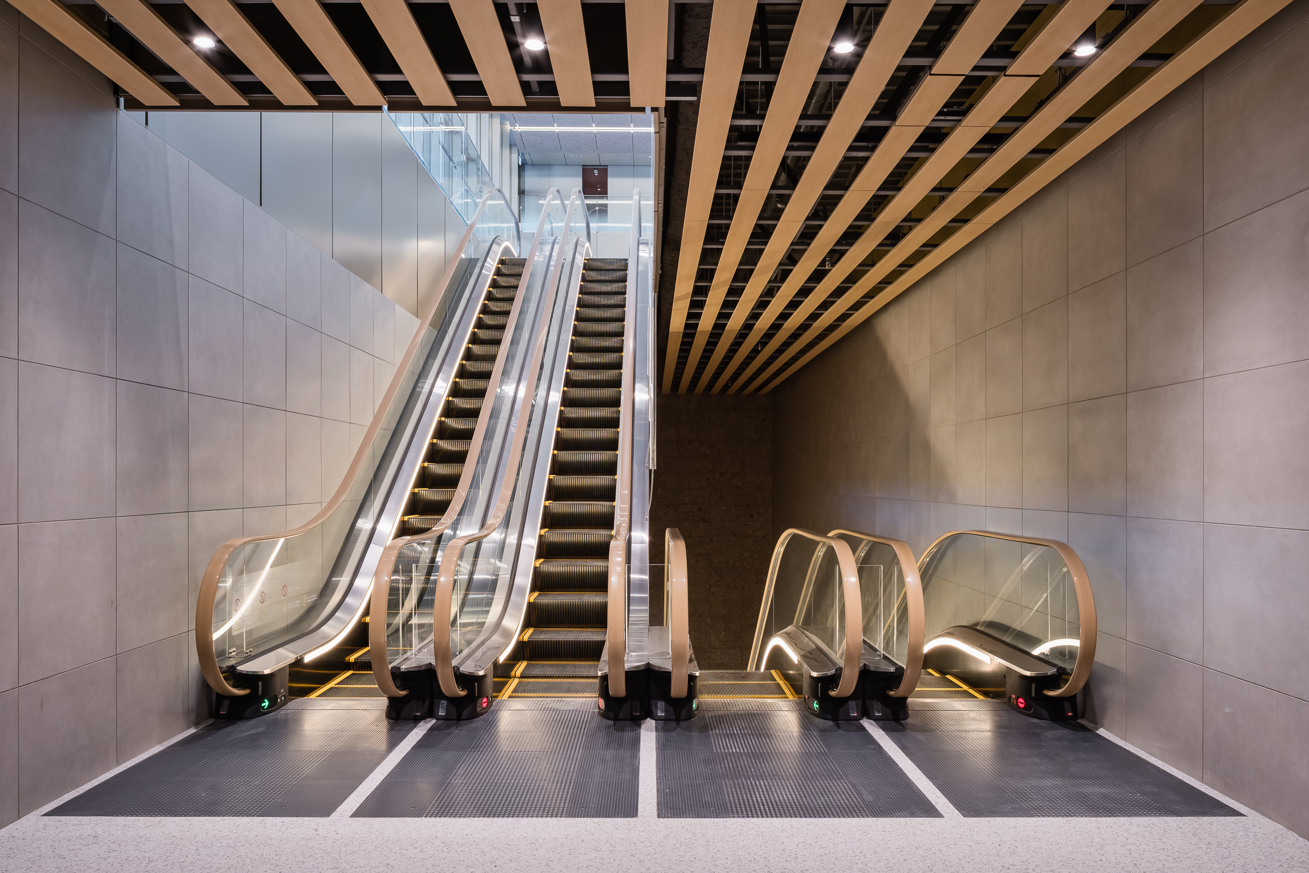 The escalators are strategically placed to align with the flow of movement in both the office and commercial areas, creating a comfortable transportation environment that considers passenger flow. The elevators in the commercial building feature colored stainless steel, creating a design that harmonizes with the facility's spatial design.